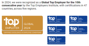 L’entreprise a été certifiéer Top Employer en 2025, une distinction qu’elle a reçue pour la 13ème année consécutive. Cette reconnaissance témoigne de son engagement à offrir un environnement de travail de haute qualité et à mettre en place des pratiques RH respectueuses du bien-être et du développement des talents.