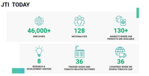 Japan Tobacco International (JTI) est un acteur majeur de l’industrie mondiale du tabac, se classant parmi les trois premiers à l’échelle internationale. Avec plus de 46 000 collaborateurs répartis à travers le monde et une présence dans 130 pays, JTI s’affirme comme un leader dans son secteur. Le siège social mondial de l’entreprise est situé à Genève, en Suisse.